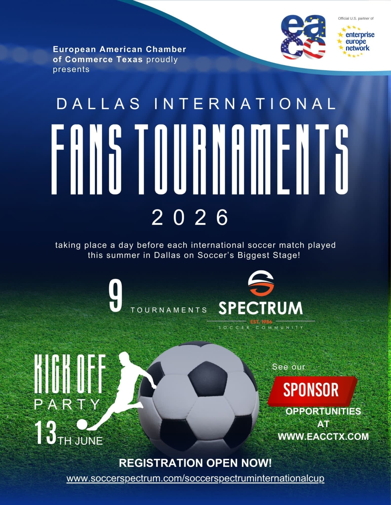 The EACC Texas is partnering with Personal Analytics and Sports Statistics, LLC (PA$$) and Soccer Spectrum to host a series of exciting International Fans Tournaments in Dallas during the summer of 2026! As part of the World Cup excitement, the EACC Texas is inviting fans from every nation competing in Dallas and around the world to participate in our series of one-day Soccer Spectrum World Cup tournaments.